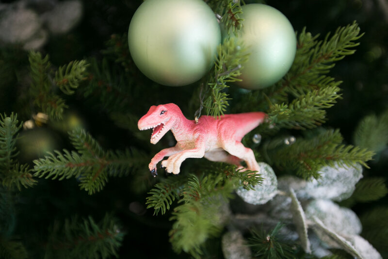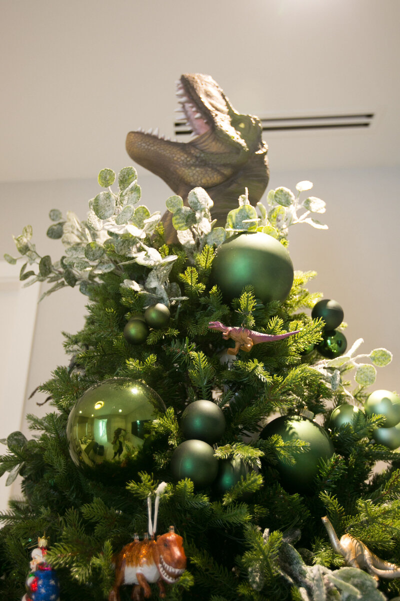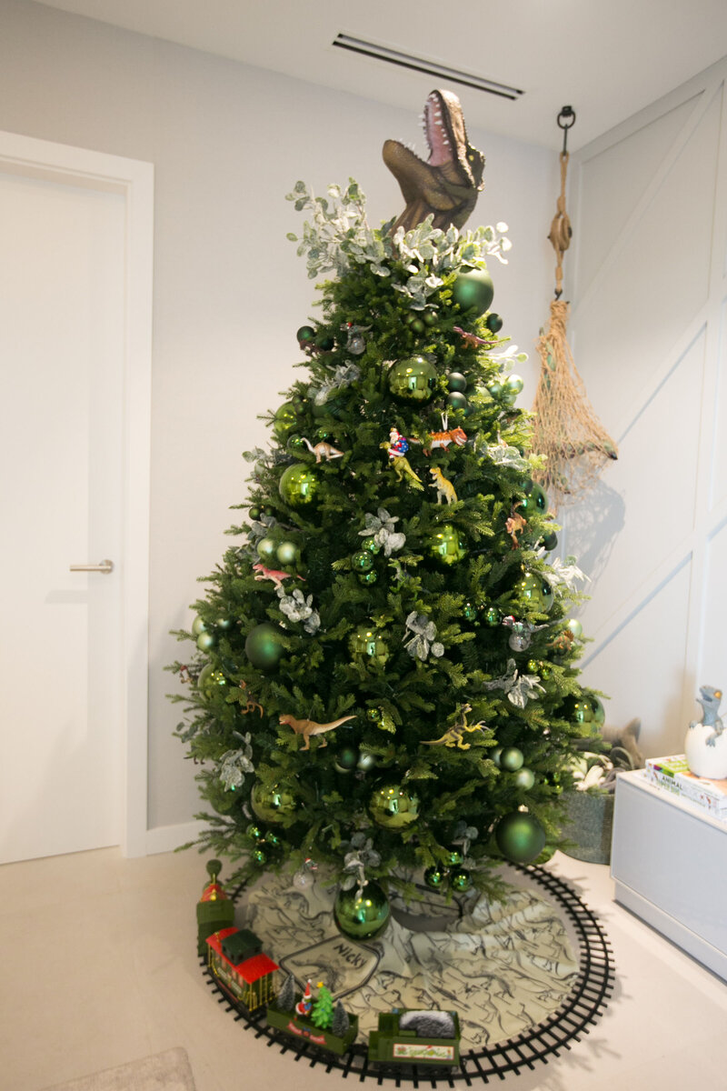 This imaginative design transforms holiday décor into a prehistoric adventure. The tree is styled in rich shades of green with metallic ornaments and frosted foliage for a lush, natural look. Playful dinosaur figurines climb through the branches, while a roaring T-Rex topper makes a bold statement at the crown. At the base, a festive train circles the tree, tying together the sense of movement and wonder. Perfect for a child’s space or themed celebration, this tree blends holiday magic with adventurous spirit in a fun and unexpected way.