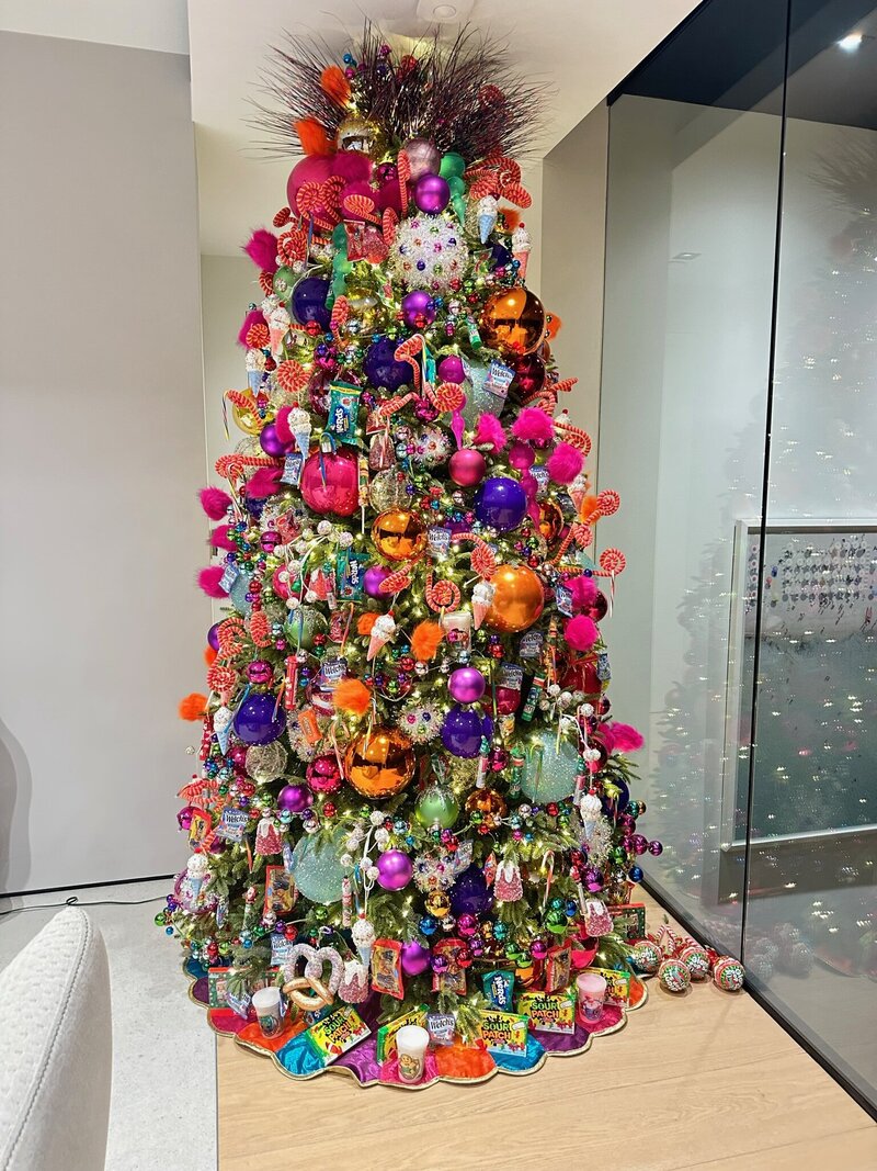 A vibrant, whimsical tree that brings the magic of a holiday wonderland to life. Layered with oversized ornaments in bold fuchsia, orange, and violet, it bursts with playful energy and modern flair. Accented with candy-inspired details mixed with real candy, lollipops, sweets, and sparkling baubles, it captures the joy and nostalgia of childhood while making a bold design statement. The tree is crowned with a dramatic topper of whimsical sprays, creating a striking focal point that draws the eye upward. A true celebration of color, creativity, and festive cheer, this design transforms tradition into a joyful spectacle.