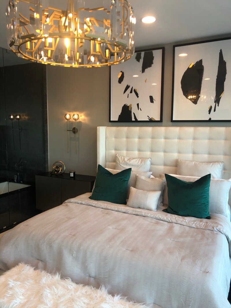 A refined blend of modern luxury and inviting comfort. This bedroom showcases a tall tufted headboard framed by bold abstract art and layered neutral bedding with deep green velvet accents. Warm gold lighting, a crystal chandelier, and sculptural decor pieces elevate the space, while the black area rug and faux fur bench introduce rich texture and contrast. Designed to feel both serene and sophisticated.