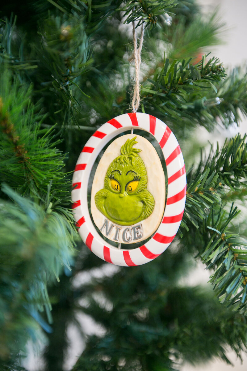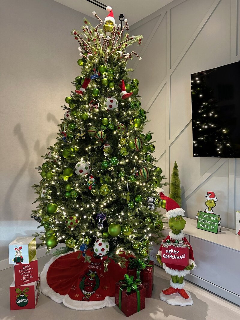 This playful holiday design brings the magic of Dr. Seuss to life with a tree inspired by The Grinch Who Stole Christmas. Layered in vibrant shades of green, oversized ornaments, and whimsical candy-cane sprays, the tree captures a fun and festive spirit. A mischievous Grinch topper peeks out from above, while themed accents, including polka-dotted baubles and character figurines, add personality and cheer. Paired with coordinating décor and presents wrapped in classic red and green, this design transforms tradition into a storybook celebration full of character and charm.