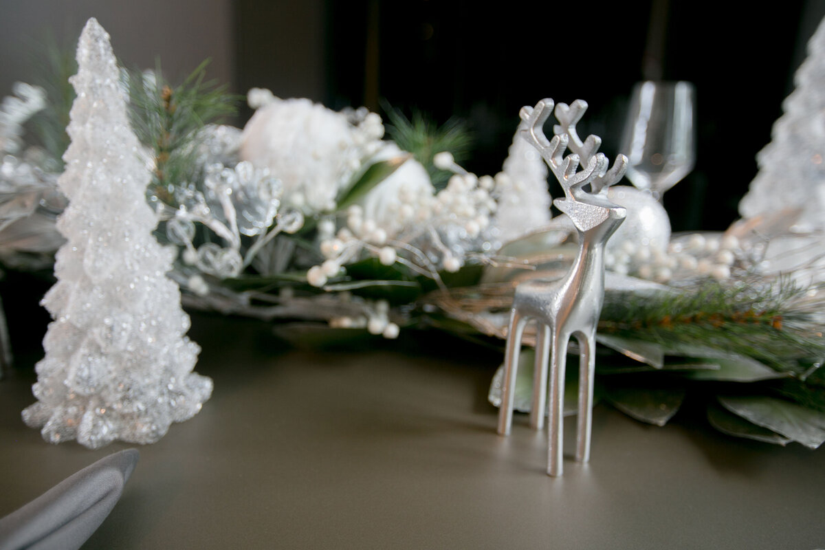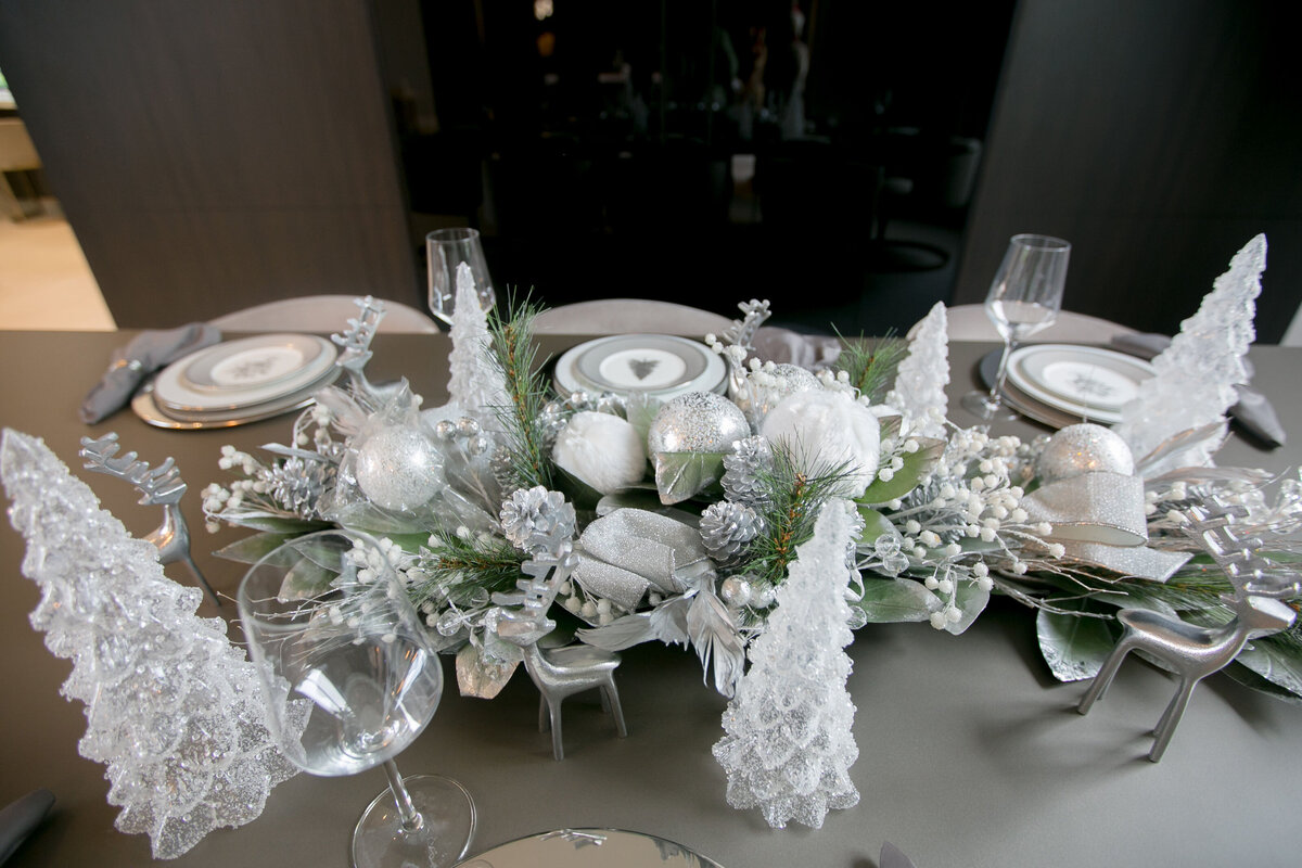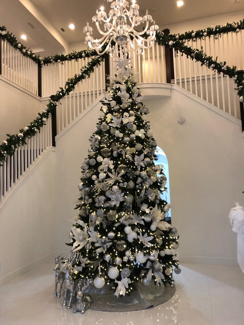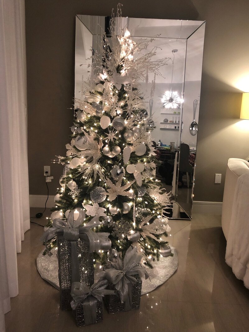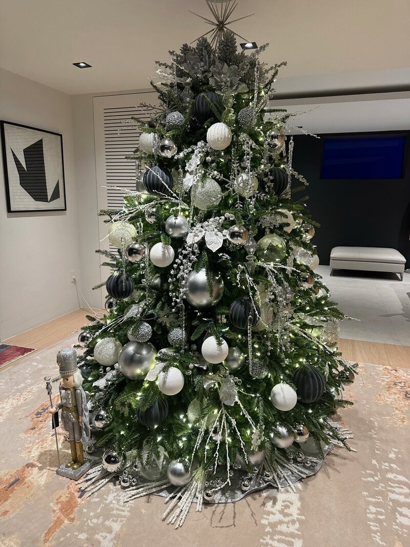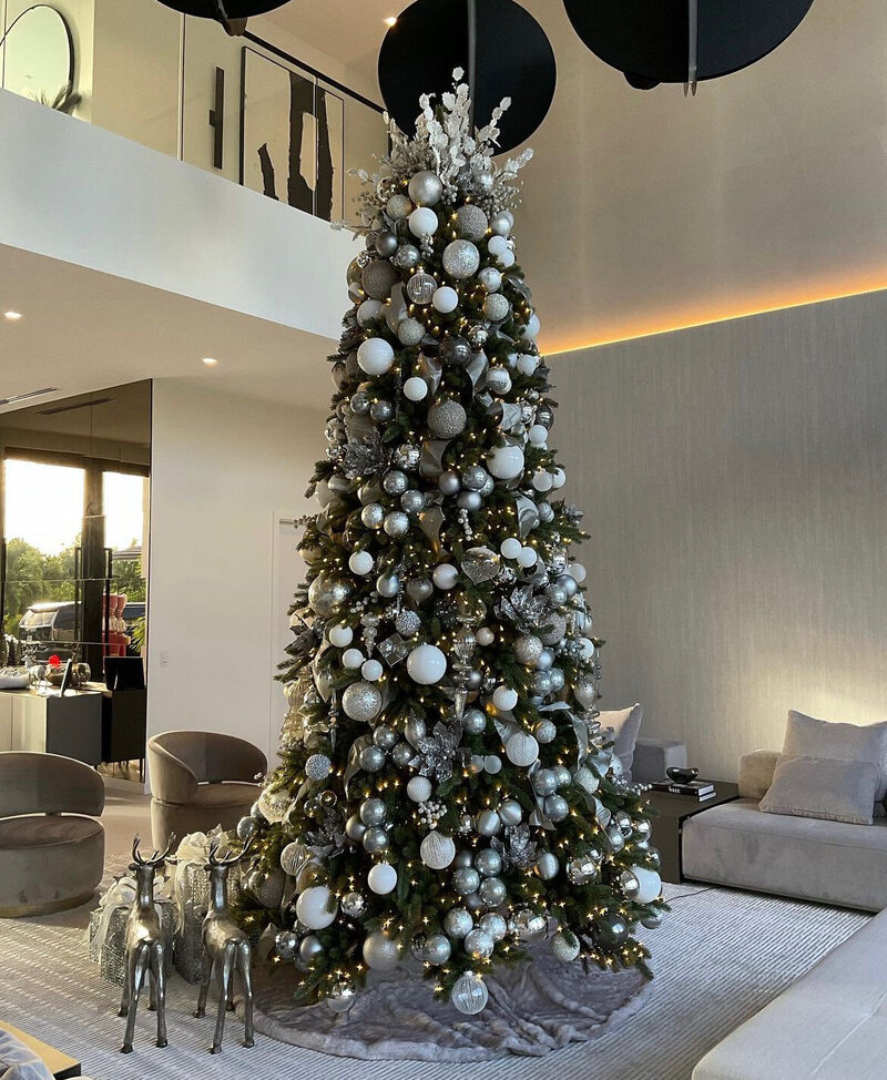 This sophisticated holiday design features a striking mix of oversized ornaments in silver, white, and metallic tones for a modern yet timeless look. Layers of shimmering baubles, frosted accents, and sparkling details create depth and dimension, while soft twinkling lights add a warm, inviting glow. Styled within a contemporary living space, the towering tree makes a grand statement, balancing glamour with refined elegance. Subtle touches complete the look for a holiday display that feels both luxurious and serene.